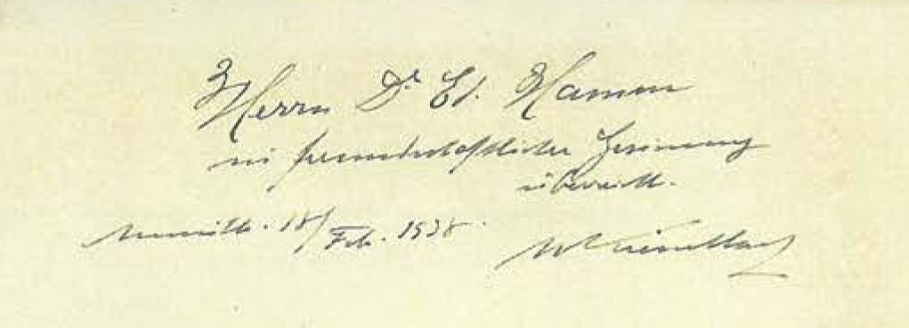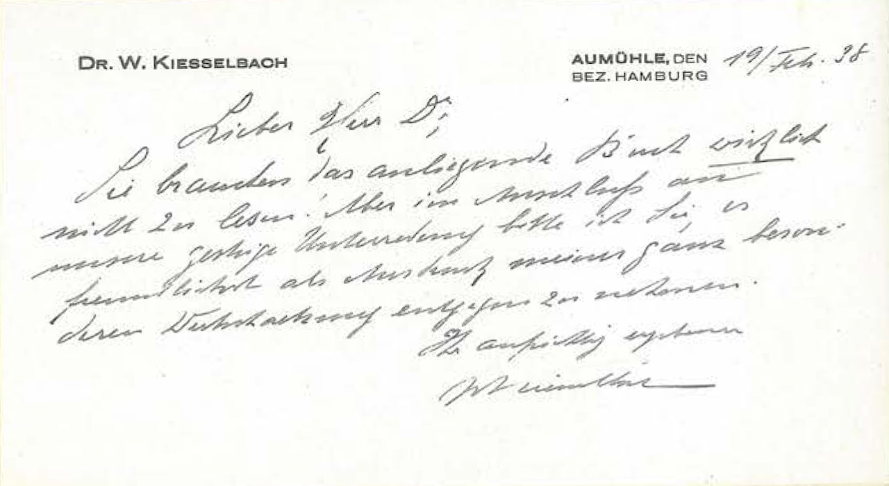 „Lieber Herr Dr., Sie brauchen das anliegende Buch wirklich nicht zu lesen. Aber im Anschluß an unsere gestrige Unterredung, bitte ich Sie, es freundlichst als Ausdruck meiner ganz besonderen Wertschätzung entgegen zu nehmen. Ihr aufrichtig ergebener W. Kiesselbach“
