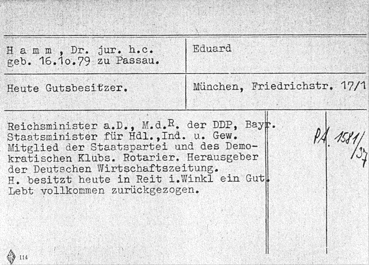 Die Karteikarte Eduard Hamms bei der Gestapo