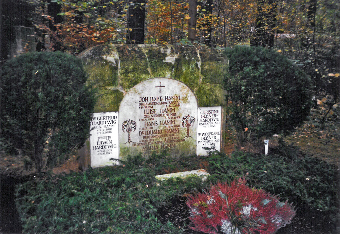 Nach der Sterbeurkunde vom 16.03.1945 kam Eduard Hamm am 23.09.1944 ums Leben. Das Begräbnis fand statt am 21.08.1946 mit einem Requiem in St. Bonifaz in München und Begräbnis im Familiengrab - Waldfriedhof - Alter Teil, 118-W-0022A/0022B.