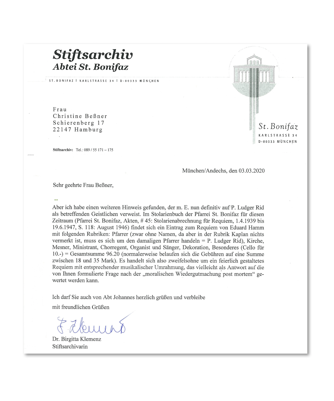 Schreiben des Stiftsarchivs Abtei St. Bonifaz