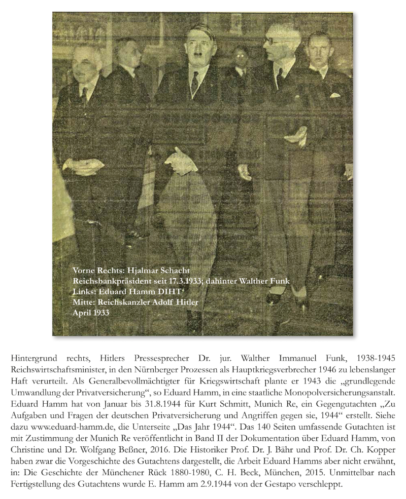 Auf dem Foto von April 1933 konnten wir nach Dr. Funk noch Dr. Horace Greeley Hjalmar Schacht identifizieren (rechts vorne). H. Schacht (DDP) wurde während der Weimarer Republik und der Regierung Dr. Marx I, der Eduard Hamm als Wirtschaftsminister angehörte, am 22.12.1923 als Reichsbankpräsident vom Reichspräsidenten Friedrich Ebert ernannt.