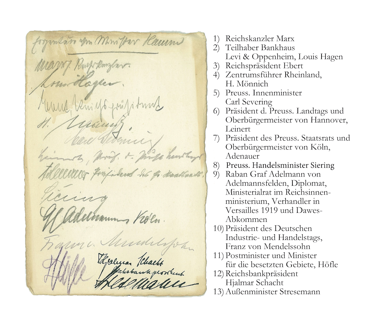 Unter dem Druck des Wahlergebnisses vom 5. Mai 1924 und des Dawes-Plans bildeten das Zentrum, DDP, DVP und BVP die Regierung mit der DNVP als stärkster Partei. Die Unterschriften der Tagungsteilnehmer übereignet der Reichskanzler Dr. Wilhelm Marx dem Reichswirtschaftsminister Eduard Hamm.